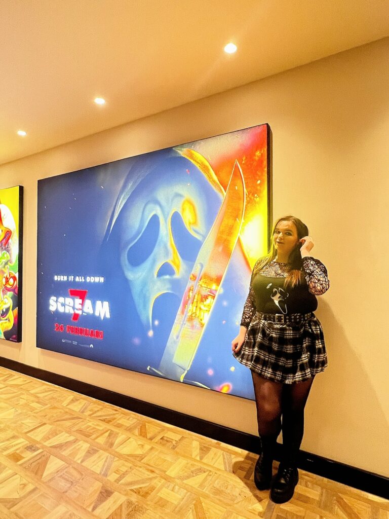 Ik zal Angie niet zijn als ik niet ontzettend vroeg was geweest. Mijn brein neemt reistijd altijd veel te ruim, vooral als ik op locatie nog een paar dingen moet doen. In dit geval moest ik nog een paar foto’s maken voor Instagram. Er was een grote poster voor Scream 7, en daar moest ik natuurlijk mee op de foto.
