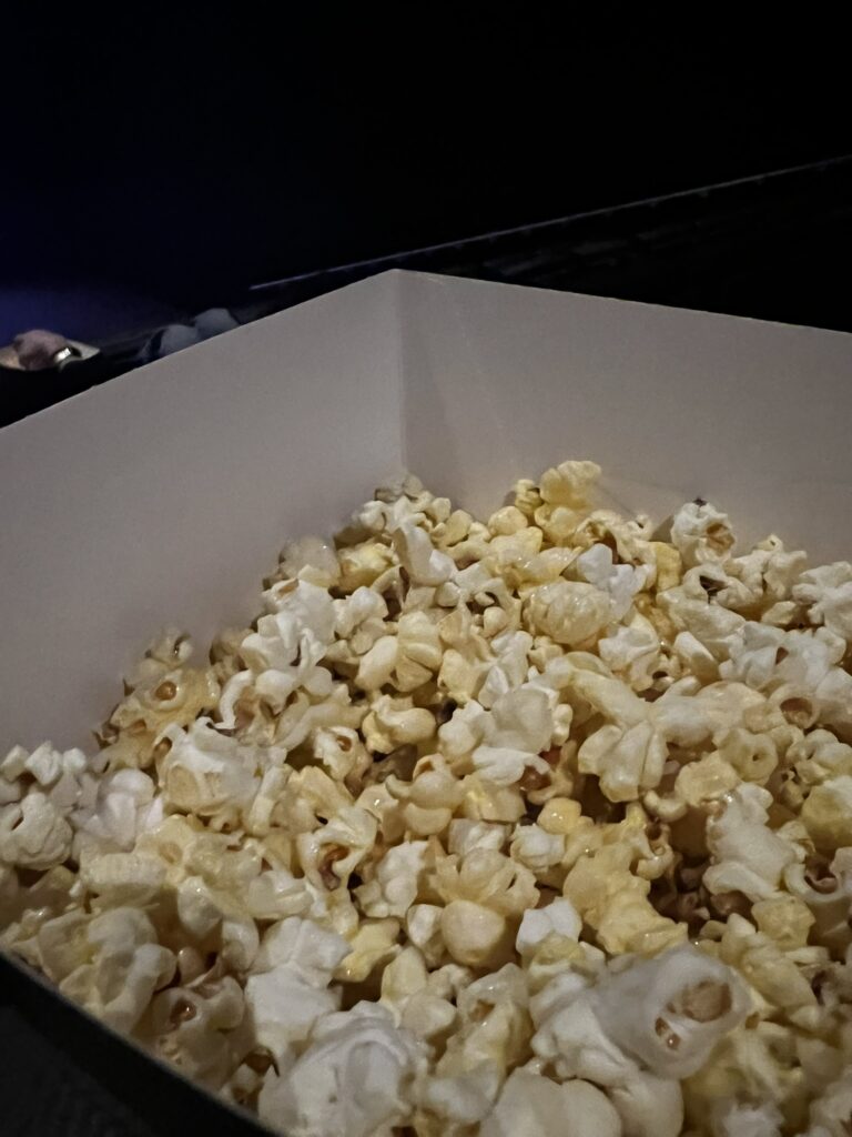 Nadat we onze snacks hadden, was het tijd om naar de zaal te gaan en onze stoelen te zoeken. We zaten op rij 3, en de rijen werden van boven naar beneden geteld. Wat dus betekende dat het een behoorlijke klim was. Maar toen we eenmaal boven waren hadden we echt een heel mooi zicht op het scherm. De zaal was ook ontzettend goed opgebouwd. De stoelen waren precies hoog genoeg zodat je niet naar iemands achterhoofd zat te kijken. Ik heb daar zo’n hekel aan. Dus kudos naar het design van deze bioscoop zaal!